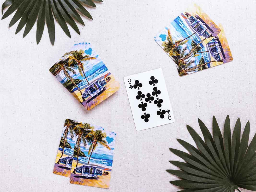 Escape to paradise with every shuffle! This luxurious deck of playing cards features a stunning fine art print of a classic popup trailer set on a sandy beach, framed by swaying palm trees.